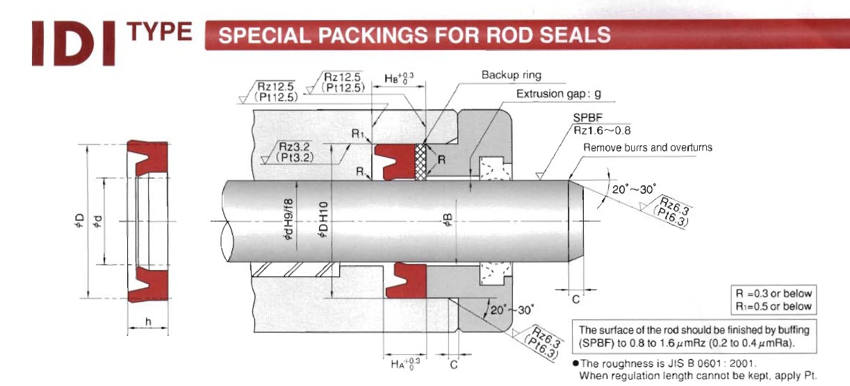 IDI型軸用密封主要材料是邵爾94度聚氨酯,壓力可達到70MPA,溫度:-35度---+100度,有極好的耐磨性和密封能力。他有較大的截面,可用于大范圍的壓力。